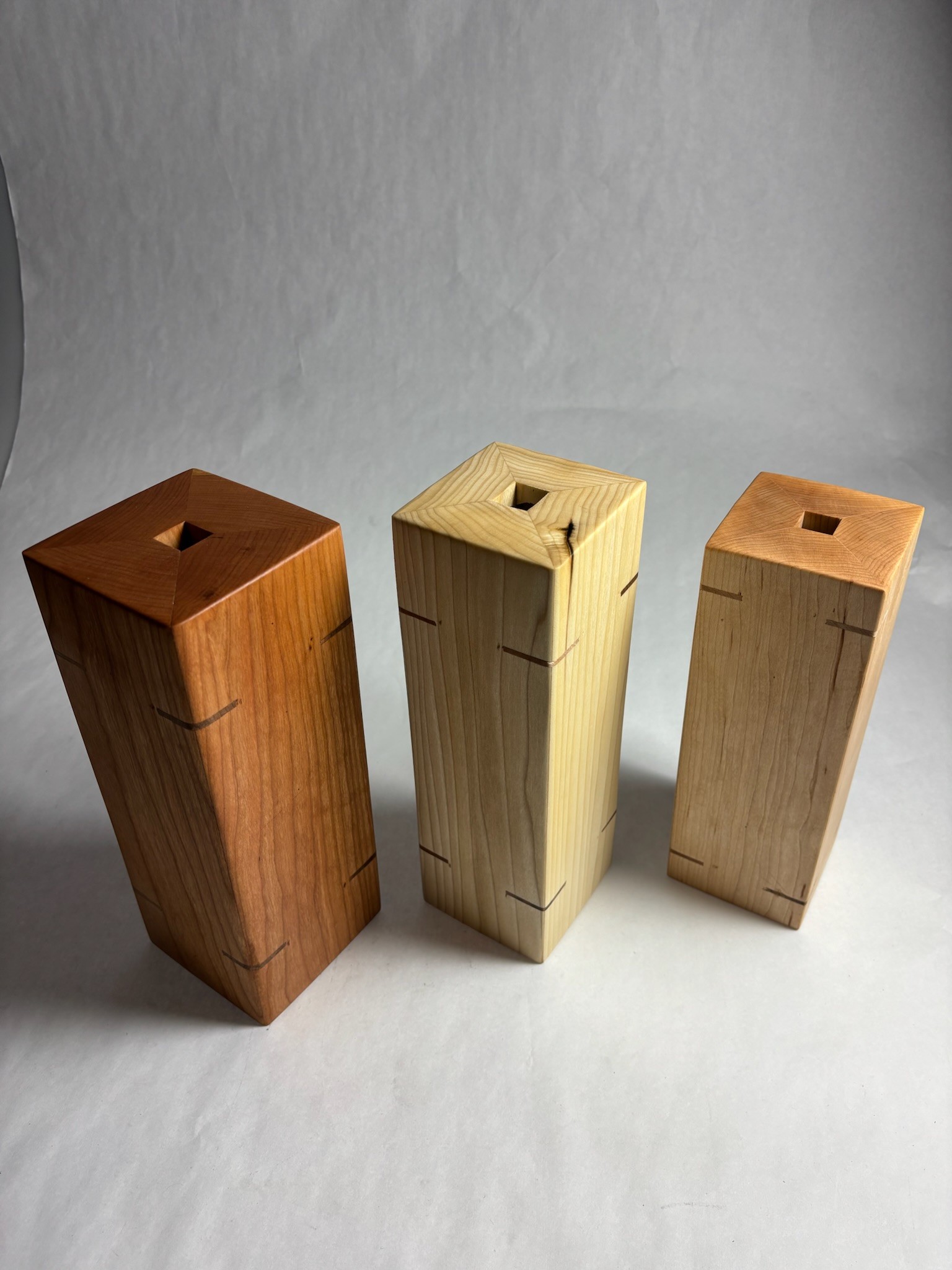 a set of three knife blocks. Each block is inlaid with neodymium rare earth magnets, strong for knives or metal tools. Each block is also made of a different wood for variance.