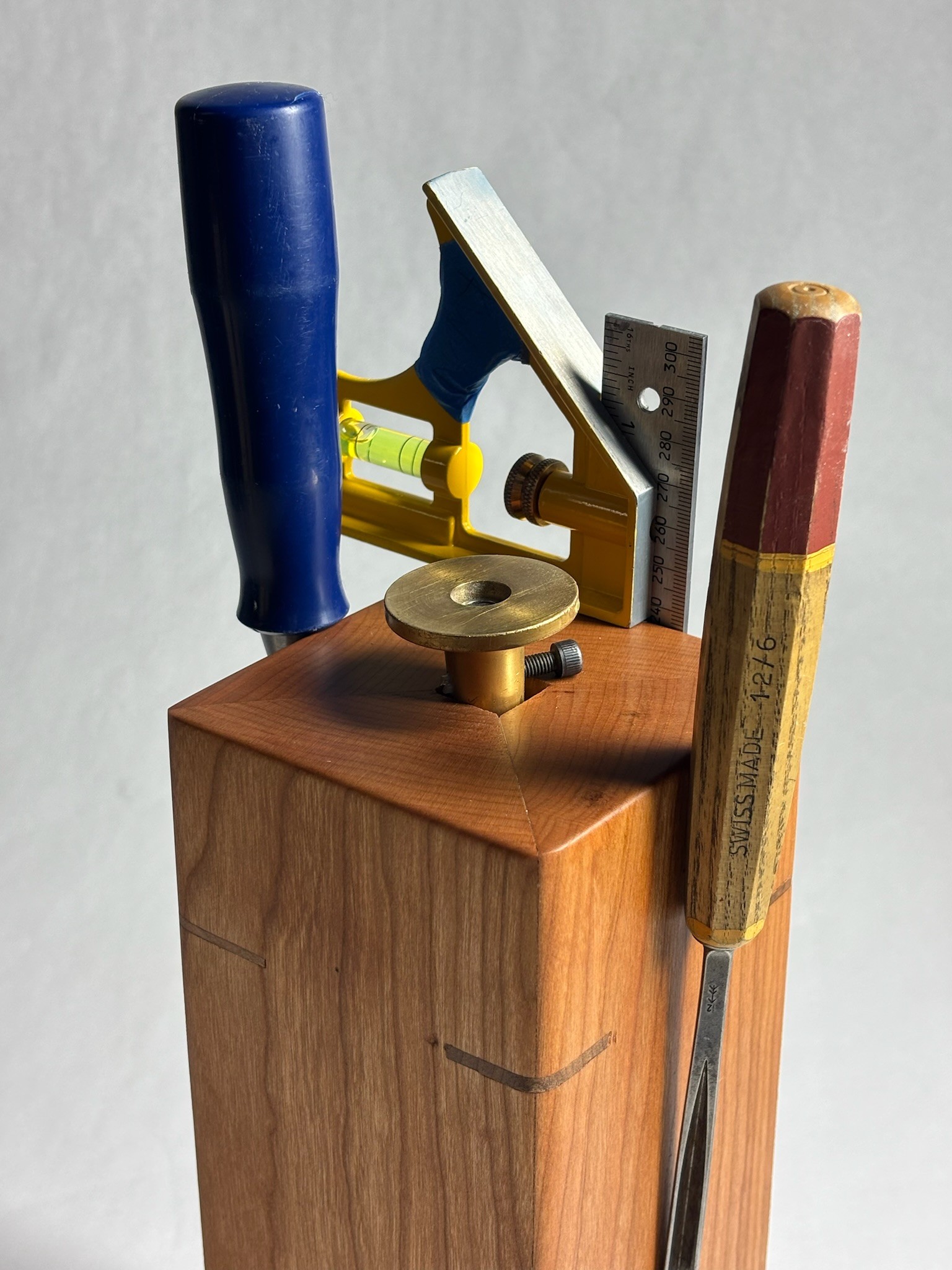 after design conception, the most significant part of the process was creating two custom jigs in order to ensure identical manufacturing. I created custom jigs for drill placement and angle alignment. THis piece was created using a miter saw, table saw, joiner, planer, belt sander, drill press, and orbital sander.