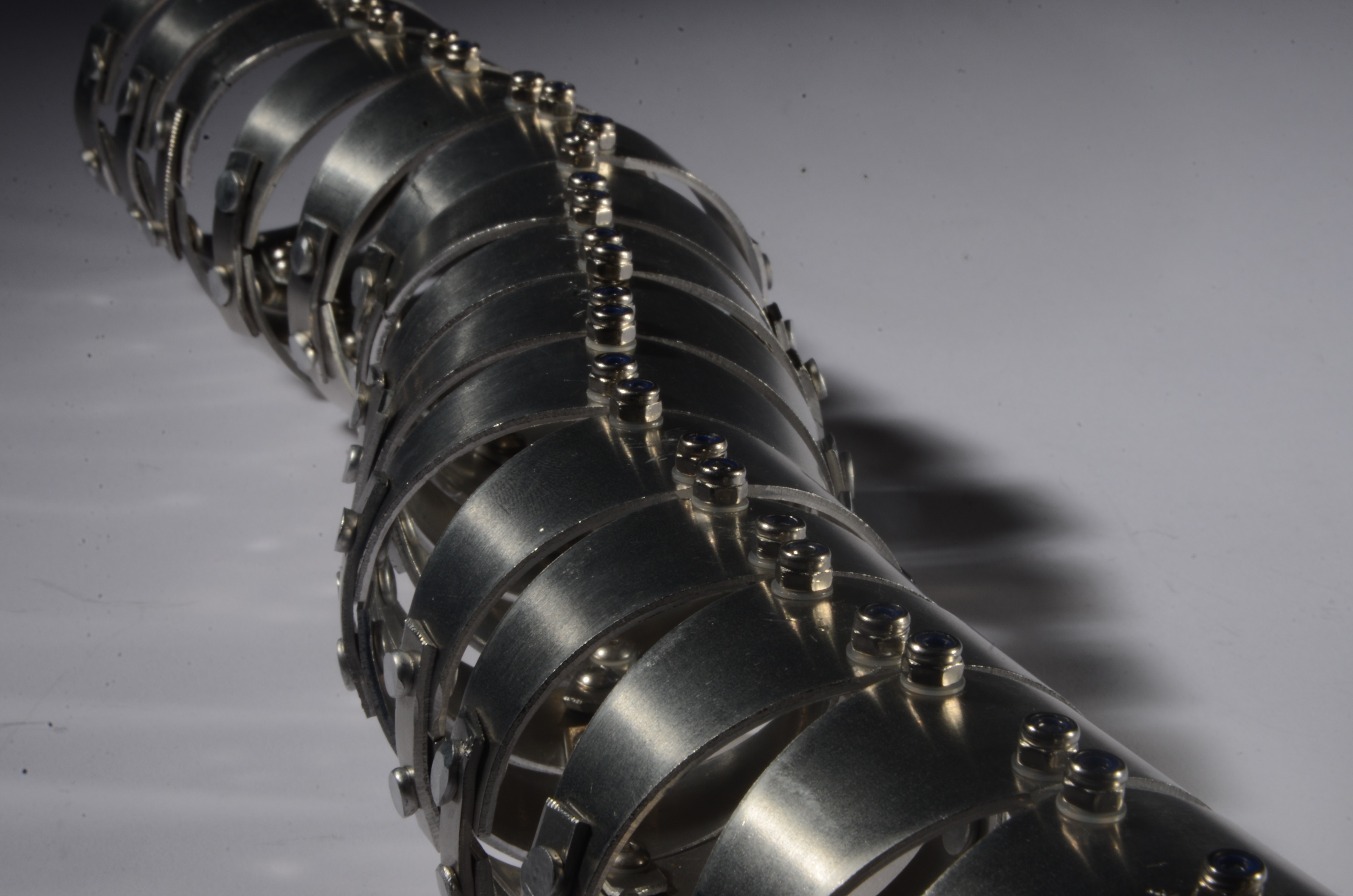 one whole object made of 19 modular components. IT is flexible and is capable of motion like a spine does. this design utilizes nylon washers for smooth joint movement and each module is fastened with nylon lock nuts for a secure yet free form.